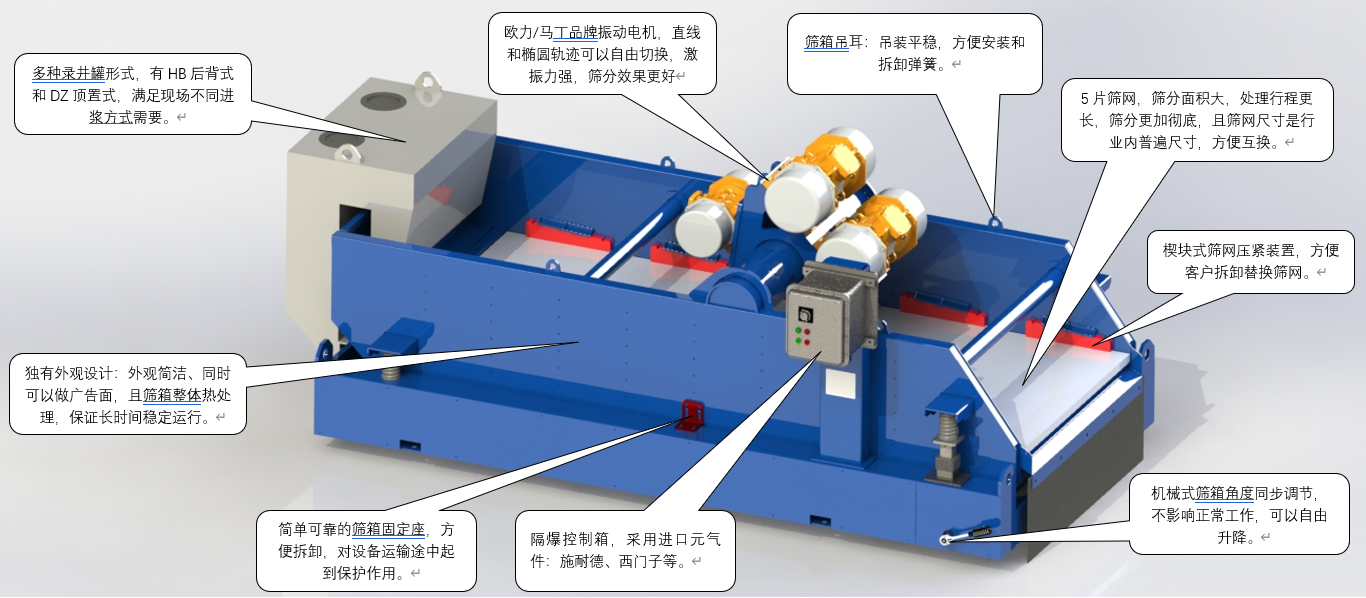 北鉆固控高頻干燥振動(dòng)篩是結(jié)合國(guó)內(nèi)外泥漿不落地市場(chǎng)需求及環(huán)保領(lǐng)域的要求自主研發(fā)的一款高激振強(qiáng)度的泥漿振動(dòng)篩,高頻干燥振動(dòng)篩能夠滿足各種鉆屑廢棄物脫水、篩分、凈化等要求。高頻干燥振動(dòng)篩是保證整個(gè)鉆屑尾漿處理持續(xù)有效進(jìn)行的必不可少的重要設(shè)備,直接將鉆井過程中振動(dòng)篩、除砂器、除泥器排出的廢棄物進(jìn)行干燥處理,干燥后可實(shí)現(xiàn)固相干堆處理。北鉆高頻干燥振動(dòng)篩可根據(jù)客戶的不同處理要求進(jìn)行特殊設(shè)計(jì),以滿足國(guó)家對(duì)各類礦山,鉆探,水處理等工程的環(huán)保要求。 GBZS系列高頻干燥振動(dòng)篩技術(shù)參數(shù) 型號(hào) GBZS584 GBZS585/GBZS585S 振動(dòng)軌跡 直線型/雙軌跡 處理量 140m³/h 165m³/h 電機(jī)功率 2×2.2kW/2x2.2+1x1.3kW 篩網(wǎng)數(shù)量 4 5 篩網(wǎng)規(guī)格 585×1165mm 585×1165mm 激振強(qiáng)度 ≥8.0G 雙振幅 5.0~6.5mm 篩箱調(diào)節(jié)角度 -1°~4° 噪音 <85db 防爆標(biāo)準(zhǔn) ExdIIBt4/IECEX/A-TEX 重量 1530kg 1950kg 外形尺寸 3080×1960×1424mm 3597X1978X1415mm 備注 以上處理量供參考,依據(jù)不同的篩網(wǎng)目數(shù)和泥漿狀況會(huì)有不同。 GBZS系列干燥篩優(yōu)勢(shì)圖示 北鉆高頻干燥振動(dòng)篩的特點(diǎn)和優(yōu)勢(shì): 1.激振強(qiáng)度高達(dá)8.0G,而且可以調(diào)節(jié),能夠有效的干燥鉆屑; 2.篩箱整體熱處理,能夠滿足高激振強(qiáng)度下長(zhǎng)時(shí)間穩(wěn)定工作; 3.電控箱內(nèi)裝的熱繼電器有過載和缺相保護(hù)功能; 4.運(yùn)動(dòng)軌跡為直線型,振幅大,運(yùn)動(dòng)速度快,能快速的進(jìn)行固液分離; 5.漏斗式進(jìn)料方式的設(shè)計(jì),有效的降低了進(jìn)料高度,方便輸送機(jī)的進(jìn)料; 6.采用國(guó)際知名品牌振動(dòng)電機(jī),意大利OLI電機(jī)或者美國(guó)Martin電機(jī); 7.主要電器元件選用西門子,施耐德或者ABB等品牌;